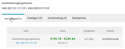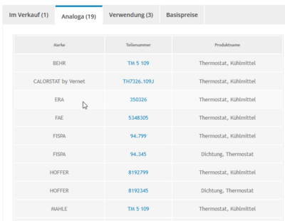 Interessant bei Webautocats ist der Analoga-Tab, der alternative Anbieter eines Ersatzteils auflistet. Zunächst das gewünschte Ersatzteil auswählen und dann zum Tab Analoga wechseln.