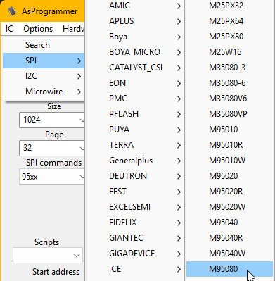 Im ersten Schritt muss unter Hardware der CH341A Programmer ausgewählt werden. Im zweiten Schritt muss unter IC, SPI, ST, M95080 ausgewählt werden. Entsprechend wird dann die Size und Page Settings sowie die SPI Commands in der Software ASProgrammier eingestellt. Im letzten Schritt oben SPI auswählen.