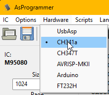 Laut Datenblatt ist der ST 95080 "Compatible with SPI Bus Serial Interface". Das ist bei der Auswahl des IC in ASProgrammer wichtig und welchen Steckplatz man im Programmer nutzen muss. Auf der Rückseite des Programmers ist SPI bzw. I2C zu finden. Demnach muss der Steckplatz Richtung USB Anschluss genutzt werden.