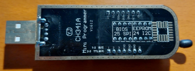 Ferner wird ein CH341A Programmer benötigt, den man für kleines Geld bei Amazon bestellen kann. Achten Sie darauf, dass eine 8 polige Klammer dabei ist, damit das IC ohne auslöten ausgelesen werden kann.